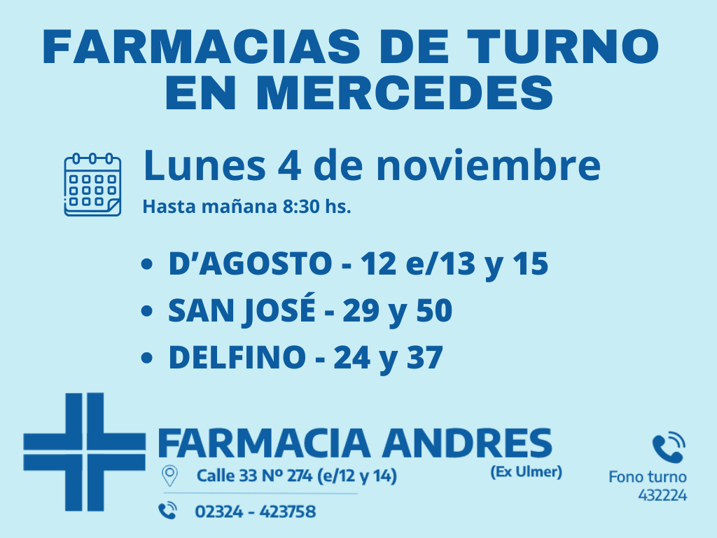 Desde las 8 30 del día de hoy hasta la misma hora de mañana las farmacias de turno en Mercedes son D’Agosto, San José y Delfino