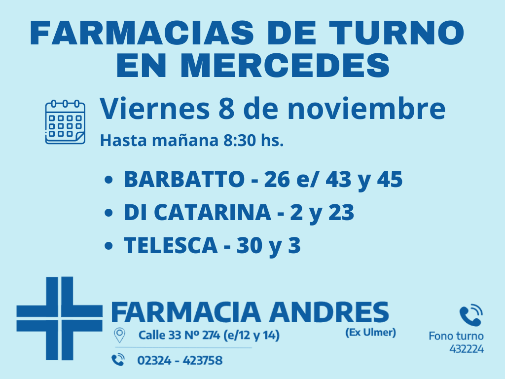 Desde las 8:30 del día de hoy hasta la misma hora de mañana, las farmacias de turno en Mercedes son: Barbatto, Di Catarina y Telesca.