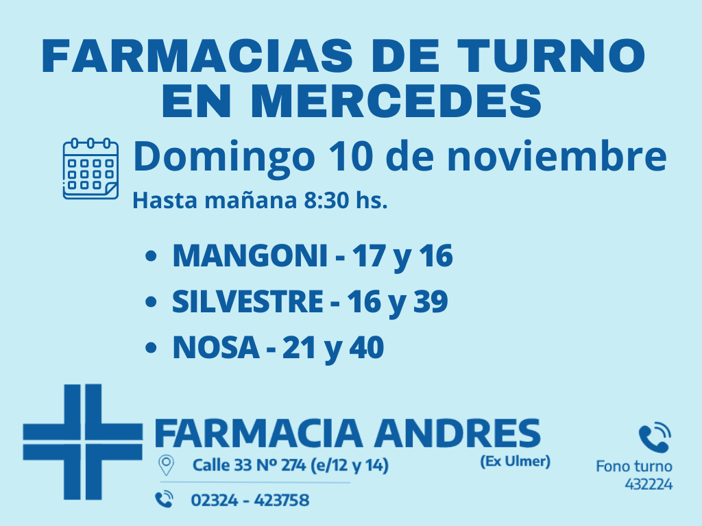 Desde las 8;30 del día de hoy hasta la misma hora de mañana, las farmacias de turno en Mercedes son: Mangoni, Silvestre y Nosa.