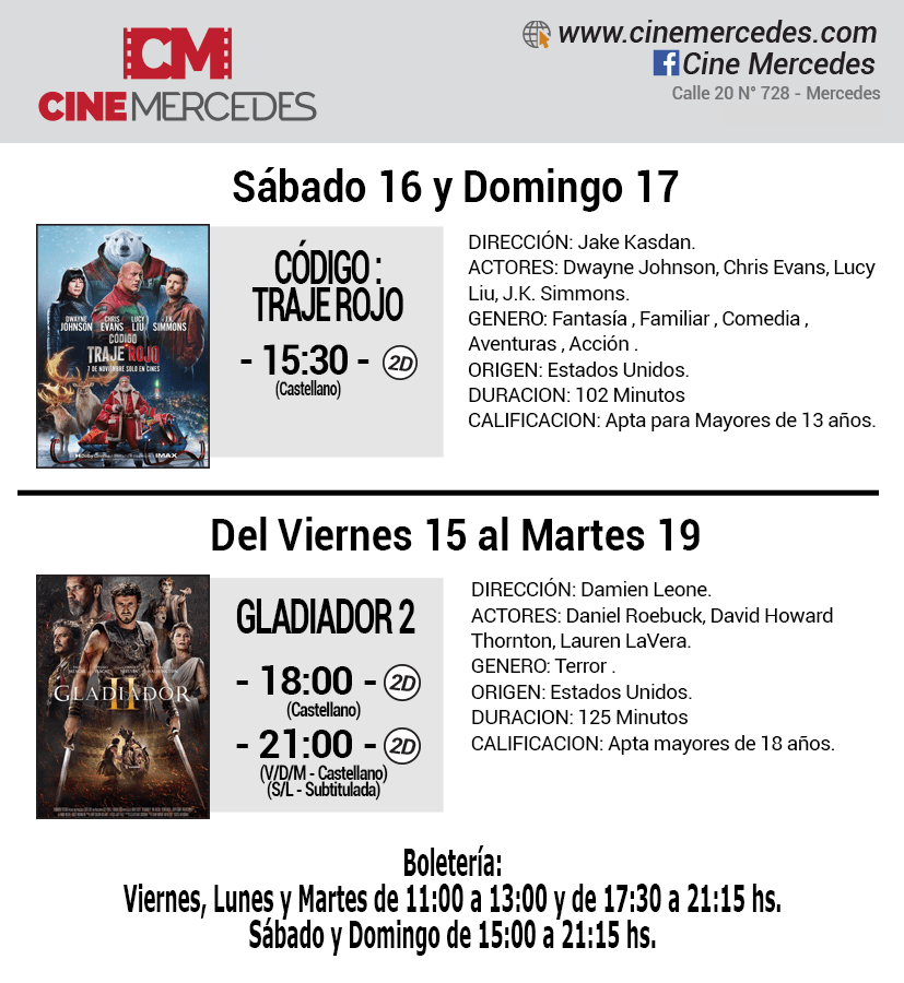 Entre el viernes 15 y el martes 19 de noviembre, la segunda parte de la histórica Gladiador llega a la gran pantalla del Cine Mercedes. En las funciones de las horas 18 y 21, en 2D, en castellano o subtitulada, las peleas en el Coliseo Romano vuelven con nuevos luchadores. También en cartelera continúa «Código: Traje Rojo» para los días sábado y domingo, 15:30 horas.