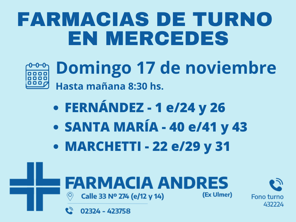 Desde las 8:30 del día de hoy hasta la misma hora de mañana, las farmacias de turno en Mercedes son: Fernández, Santa María y Marchetti.