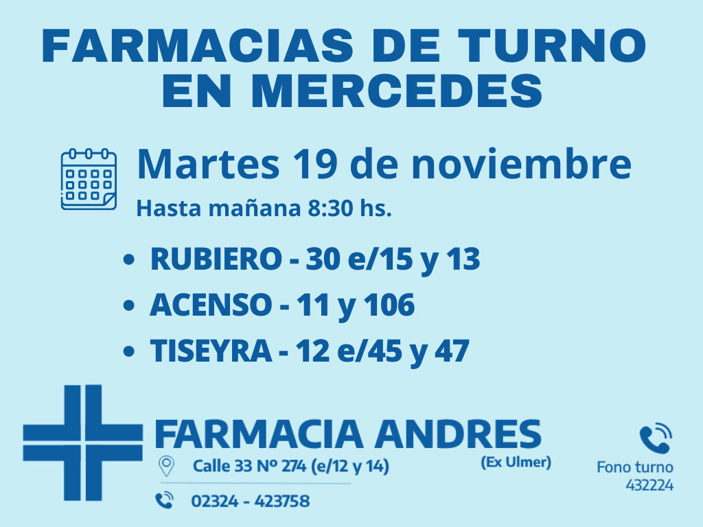 Farmacias de turno del martes 19 de noviembre 19 noviembre, 2024Desde las 8 30 del día de hoy hasta la misma hora de mañana las farmacias de turno en Mercedes son Rubiero, Tiseyra y AcensoComparte esto: Haz clic para compartir en WhatsApp (Se abre en una ventana nueva) WhatsApp Haz clic para compartir en Telegram (Se abre en una ventana nueva) Telegram Haz clic para compartir en X (Se abre en una ventana nueva) X Haz clic para compartir en Facebook (Se abre en una ventana nueva) Facebook TE PUEDE INTERESARCOMENTARIOS Comentarios