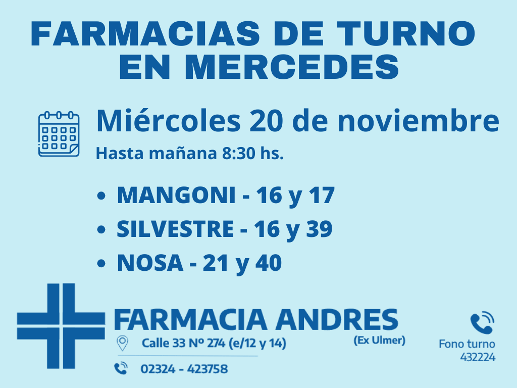Farmacias de turno del miércoles 20 de noviembre 20 noviembre, 2024Desde las 8 30 del día de hoy hasta la misma hora de mañana las farmacias de turno en Mercedes son Mangoni, Silvestre y NosaComparte esto: Haz clic para compartir en WhatsApp (Se abre en una ventana nueva) WhatsApp Haz clic para compartir en Telegram (Se abre en una ventana nueva) Telegram Haz clic para compartir en X (Se abre en una ventana nueva) X Haz clic para compartir en Facebook (Se abre en una ventana nueva) Facebook TE PUEDE INTERESARCOMENTARIOS Comentarios