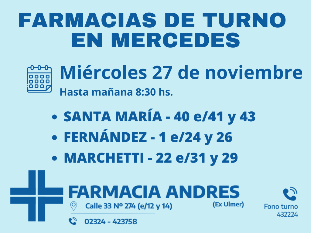 Desde las 8 30 del día de hoy hasta la misma hora de mañana las farmacias de turno en Mercedes son Santa María, Fernández y Marchetti