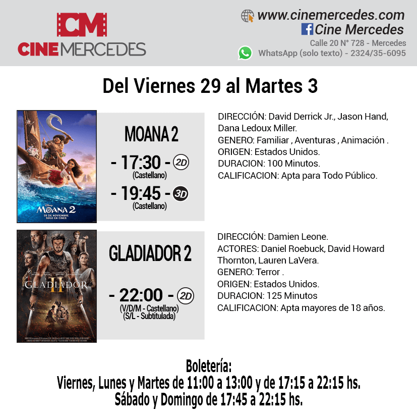 Desde el viernes 29 de noviembre, al martes 3 de diciembre, el Cine Mercedes continúa proyectando la segunda parte de Gladiador, y suma un estreno mundial de animación para toda la familia: Moana.