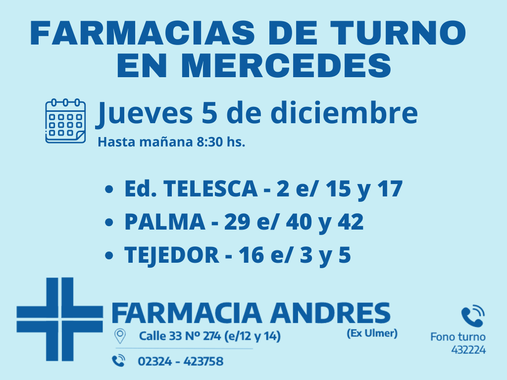 Desde las 8 30 del día de hoy hasta la misma hora de mañana las farmacias de turno en Mercedes son Eduardo Telesca, Palma y Tejedor