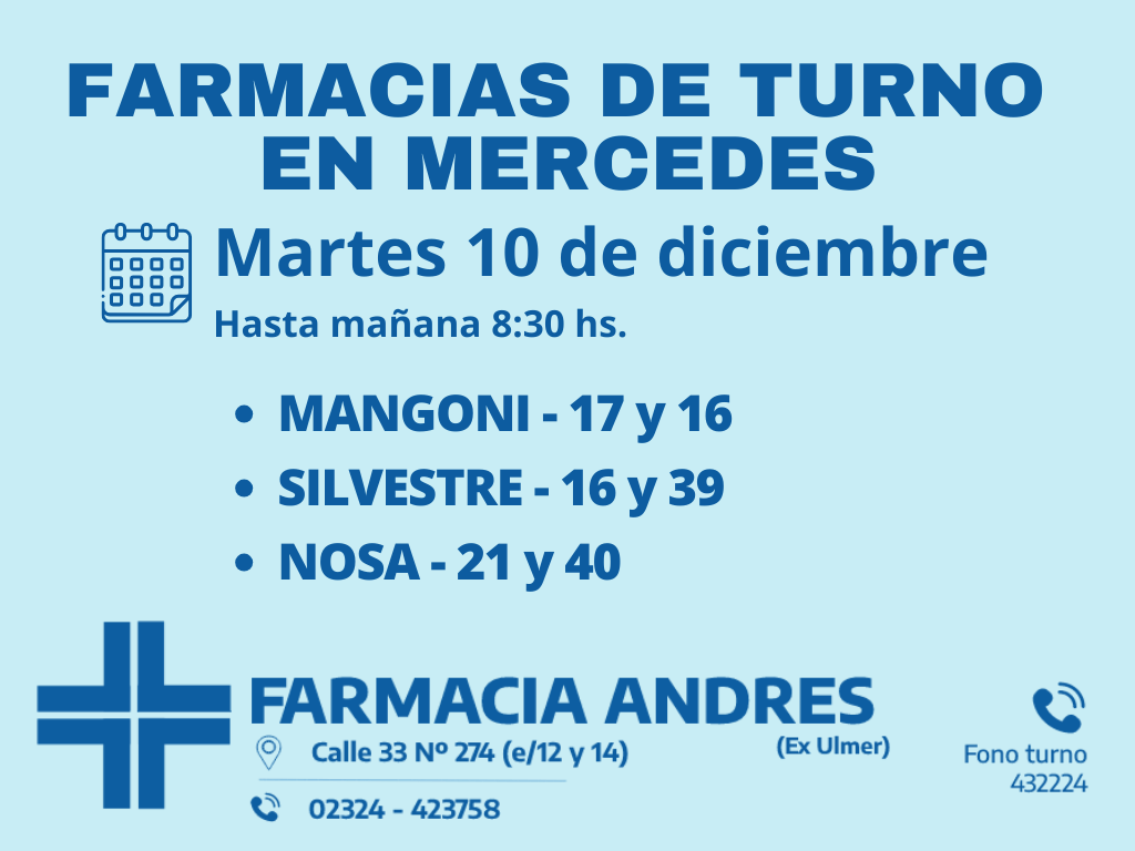 Farmacias de turno del martes 10 de diciembre 10 diciembre, 2024Desde las 8 30 del día de hoy hasta la misma hora de mañana las farmacias de turno en Mercedes son Mangoni, Silvestre y NosaComparte esto: Haz clic para compartir en WhatsApp (Se abre en una ventana nueva) WhatsApp Haz clic para compartir en Telegram (Se abre en una ventana nueva) Telegram Haz clic para compartir en X (Se abre en una ventana nueva) X Haz clic para compartir en Facebook (Se abre en una ventana nueva) Facebook TE PUEDE INTERESARCOMENTARIOS Comentarios