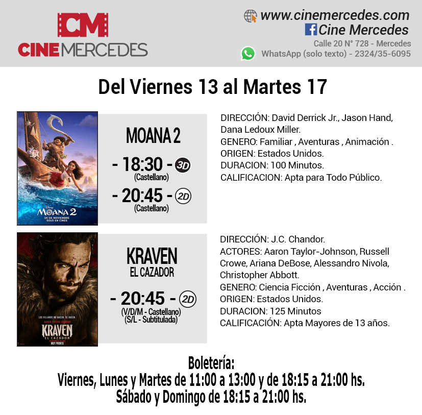 Desde el Cine Mercedes anunciaron que desde el viernes 13 al martes 17 de diciembre, estarán proyectando la segunda parte de Moana y el estreno «Kraven, el cazador».