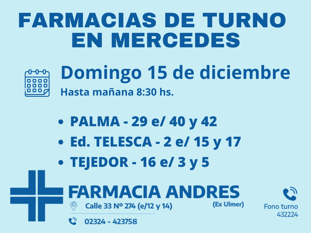 Desde las 8;30 del día de hoy hasta la misma hora de mañana, las farmacias de turno en Mercedes son: Palma, Eduardo Telesca y Tejedor.