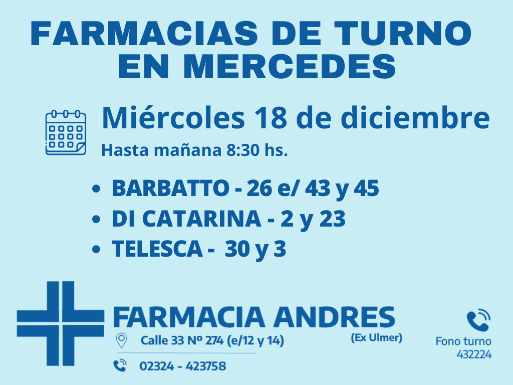 Desde las 8:30 del día de hoy hasta la misma hora de mañana las farmacias de turno en Mercedes son Barbatto, Di Catarina y Telesca.