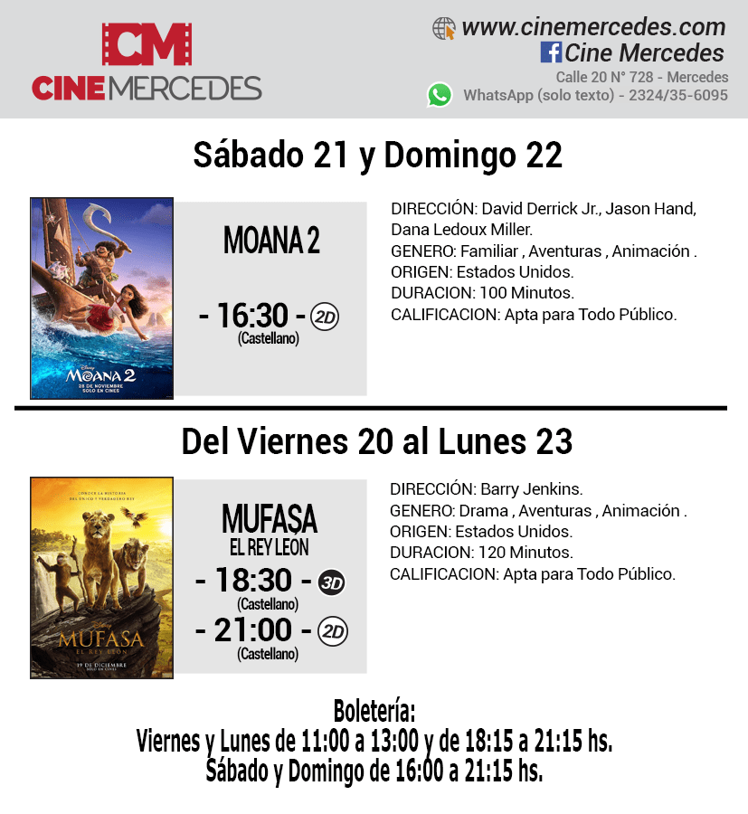 Desde el viernes 20 hasta el lunes 23 de diciembre, el Cine Mercedes proyecta Mufasa, una película que retoma parte de la historia del «Rey León». También, en pantalla continúa la segunda parte de Moana.