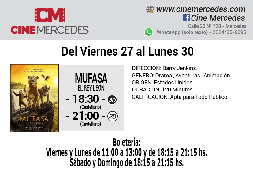 Desde el viernes 27 hasta el lunes 30 de diciembre, el Cine Mercedes ofrece en su cartelera la secuela del Rey León, «Mufasa». Se podrá ver en las funciones de las 18:30 y 21 horas.