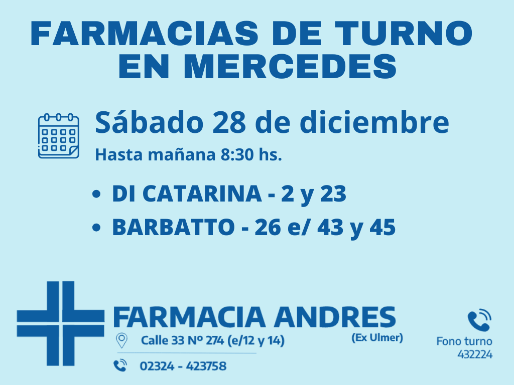 Desde las 8:30 del día de hoy hasta la misma hora de mañana, las farmacias de turno en Mercedes son: Di Catarina y Barbatto.