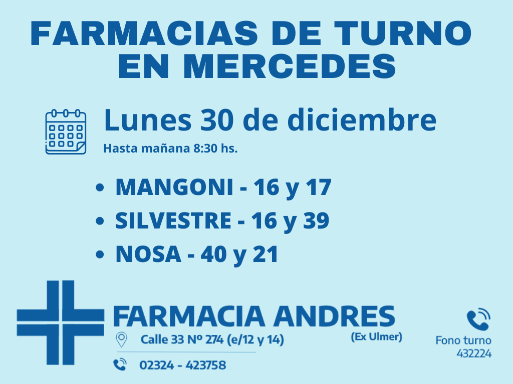 Farmacias de turno del lunes 30 de diciembre 30 diciembre, 2024Desde las 8 30 del día de hoy hasta la misma hora de mañana las farmacias de turno en Mercedes son Mangoni, Silvestre y NosaComparte esto: Haz clic para compartir en WhatsApp (Se abre en una ventana nueva) WhatsApp Haz clic para compartir en Telegram (Se abre en una ventana nueva) Telegram Haz clic para compartir en X (Se abre en una ventana nueva) X Haz clic para compartir en Facebook (Se abre en una ventana nueva) Facebook TE PUEDE INTERESARCOMENTARIOS Comentarios