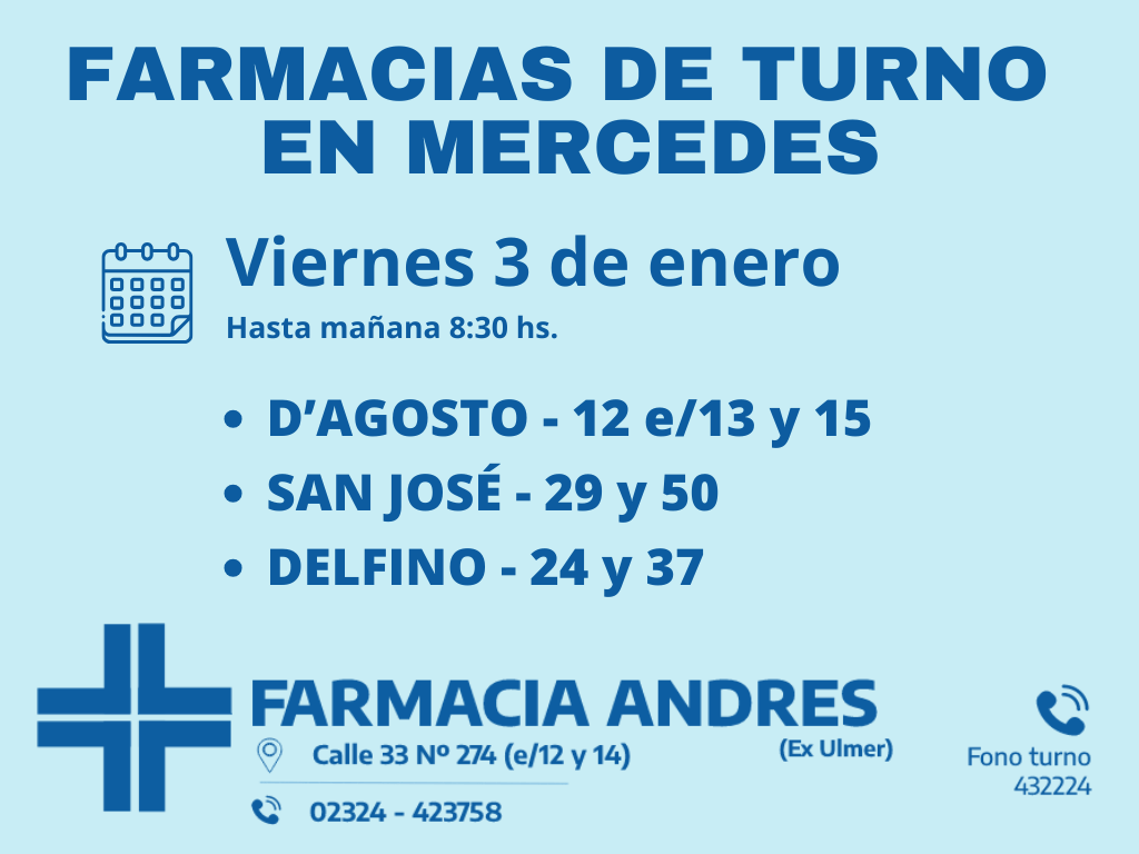 Desde las 8:30 del día de hoy hasta la misma hora de mañana las farmacias de turno en Mercedes son D’Agosto, San José y Delfino.