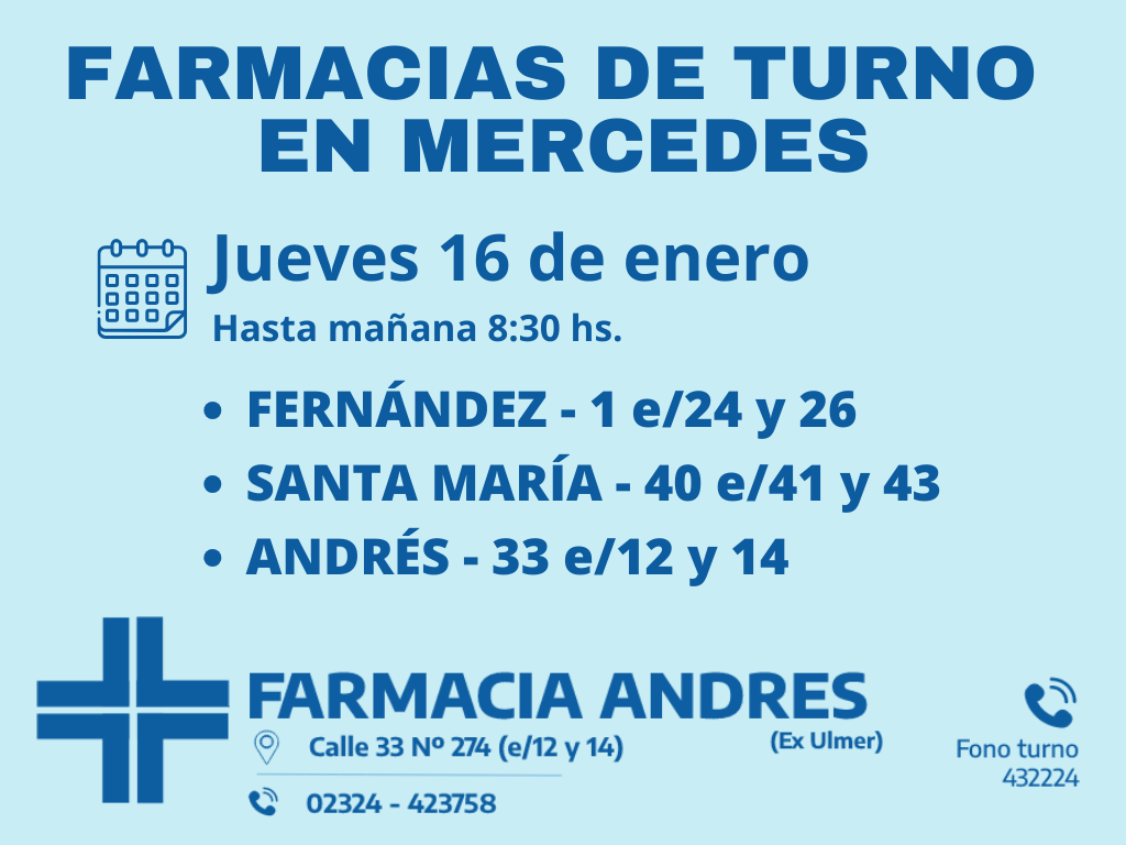 Desde las 8 30 del día de hoy hasta la misma hora de mañana las farmacias de turno en Mercedes son Fernández, Santa María y Andrés