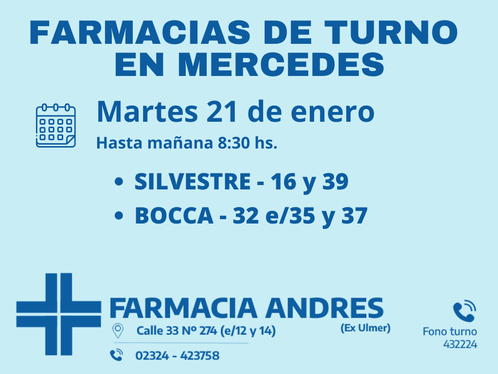 Farmacias de turno del martes 21 de enero 21 enero, 2025Desde las 8 30 del día de hoy hasta la misma hora de mañana las farmacias de turno en Mercedes son Silvestre y Bocca.Comparte esto: Haz clic para compartir en WhatsApp (Se abre en una ventana nueva) WhatsApp Haz clic para compartir en Telegram (Se abre en una ventana nueva) Telegram Haz clic para compartir en X (Se abre en una ventana nueva) X Haz clic para compartir en Facebook (Se abre en una ventana nueva) Facebook TE PUEDE INTERESARCOMENTARIOS Comentarios