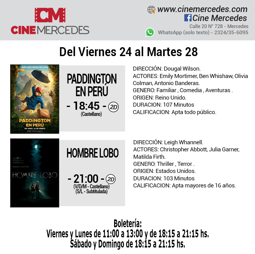El Cine Mercedes presentará entre el viernes 24 y el martes 28 de enero dos películas que atrae a un público diverso. En la primera función del día, 18:45 hs, podrá verse «Paddington en Perú» con animación, comedia y aventuras. En tanto, a la hora 21, la pantalla local presenta a «Hombre Lobo» un thriller de terror.