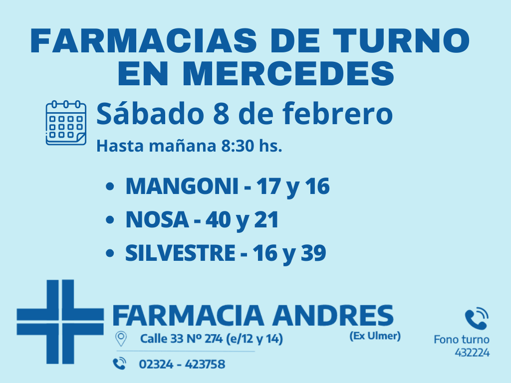 Farmacias de turno del sábado 8 de febrero 8 febrero, 2025Desde las 8:30 del día de hoy hasta la misma hora de mañana las farmacias de turno en Mercedes son Mangoni, Silvestre y NosaComparte esto: Haz clic para compartir en WhatsApp (Se abre en una ventana nueva) WhatsApp Haz clic para compartir en Telegram (Se abre en una ventana nueva) Telegram Haz clic para compartir en X (Se abre en una ventana nueva) X Haz clic para compartir en Facebook (Se abre en una ventana nueva) Facebook TE PUEDE INTERESARCOMENTARIOS Comentarios