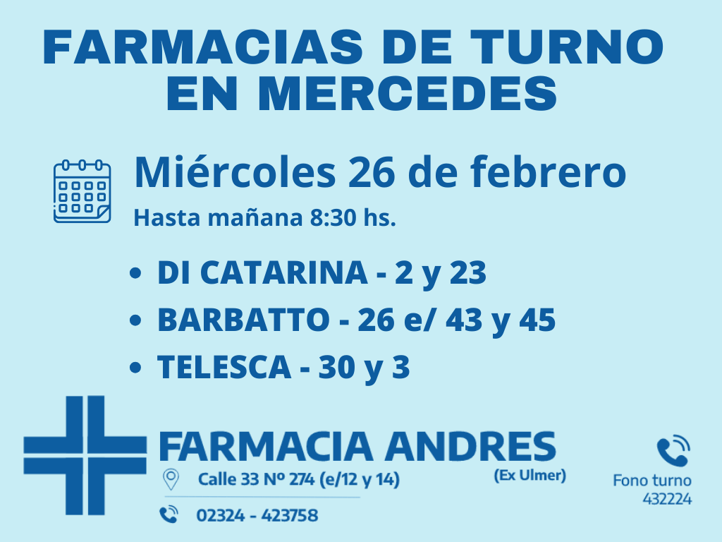 Desde las 8:30 del día de hoy hasta la misma hora de mañana, las farmacias de turno en Mercedes son: Di Catarina, Barbatto y Telesca.