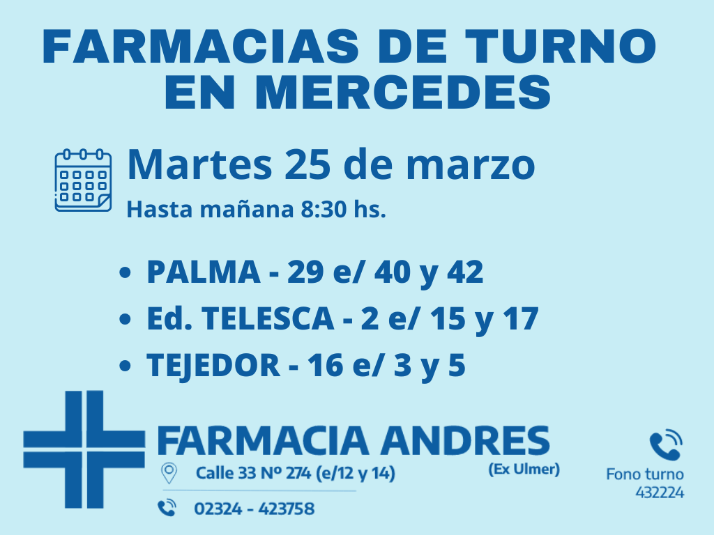 Desde las 8:30 del día de hoy hasta la misma hora de mañana, las farmacias de turno en Mercedes son: Palma, Eduardo Telesca y Tejedor.