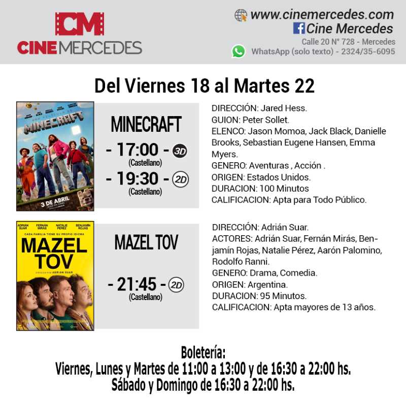 Desde el viernes 18 al martes 22 de abril, el Cine Mercedes presenta en su pantalla el estreno de cine argentino «Mazel Tov». En las funciones de la hora 21:45 podrá verse la película que protagoniza Adrián Suar. En tanto, en la funciones de las 17 y las 19:30 sigue en cartelera Minecraft.