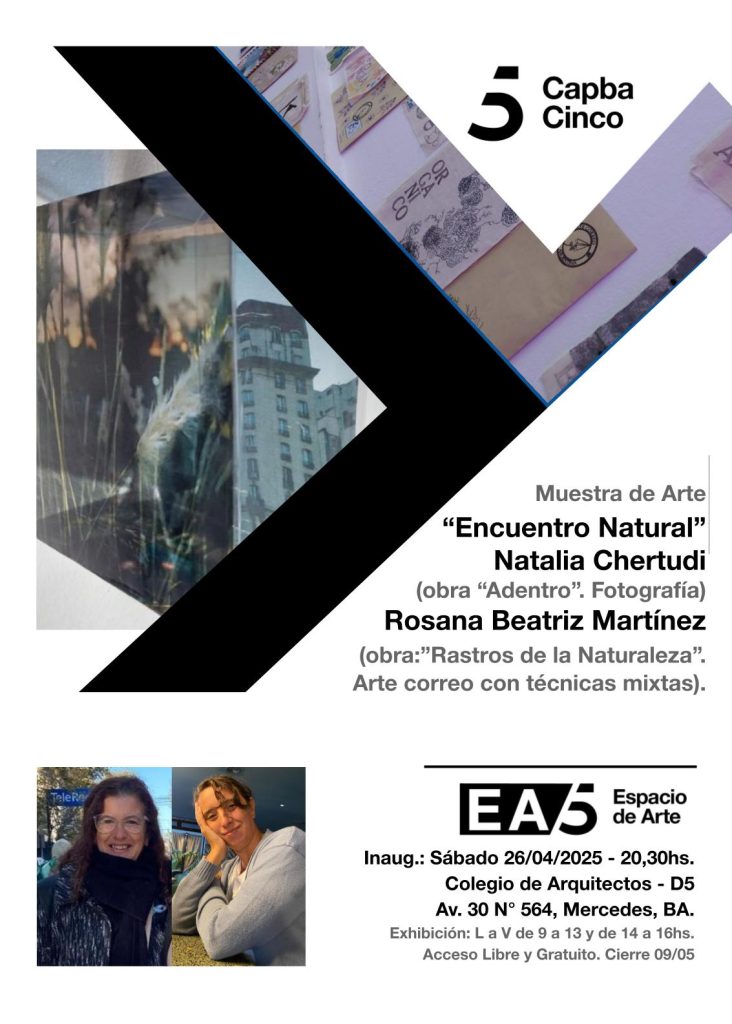 En esta oportunidad expondrán las artistas plásticas Natalia Chertudi (obra “Adentro”. Fotografía) y Rosana Beatriz Martínez (obra:”Rastros de la Naturaleza”. Arte correo con técnicas mixtas) con su muestra titulada “Encuentro natural «.