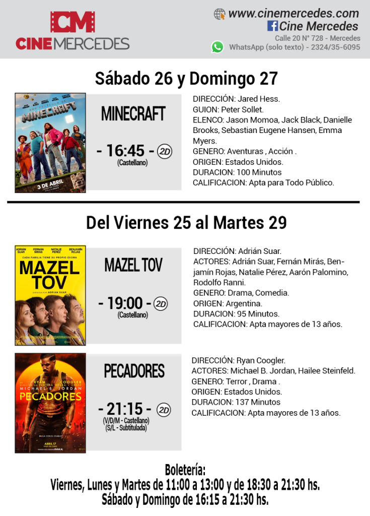 Desde el viernes 25 al martes 29 de abril, el Cine Mercedes ofrece tres películas para la cartelera local. Sigue la película argentina «Mazel Tov» a la hora 19, en tanto, se estrena «Pecadores» en la función de la 21:15 hs. Finalmente, sábado y domingo, podrá verse «Minecraft» a la hora 16:45.