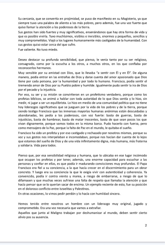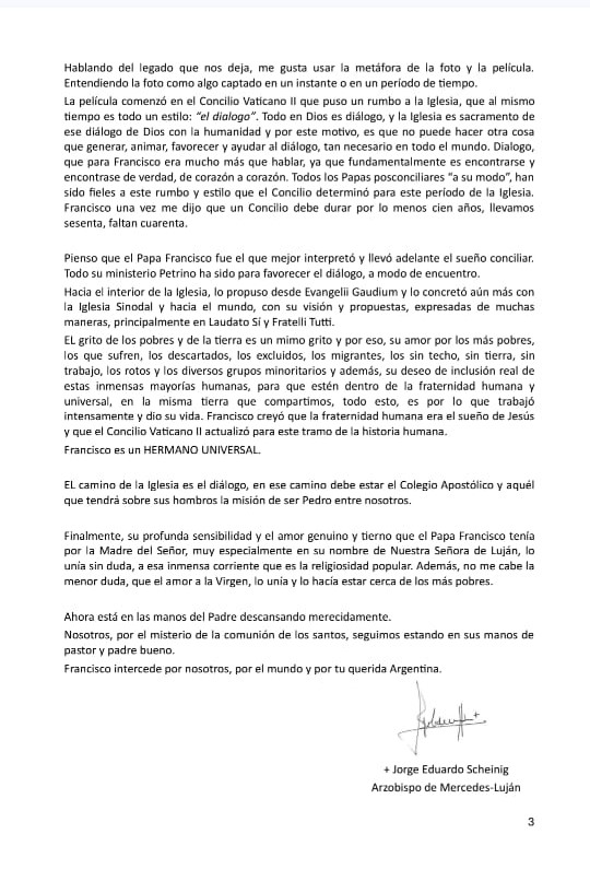 Scheinig remarcó que la muerte de Francisco en tiempo de Pascua es “un signo de su comunión profunda con Jesús” y valoró que “toda su vida buscó el bien de la Iglesia y del mundo, sin querer agrandar su figura ni desconocer sus fragilidades”.