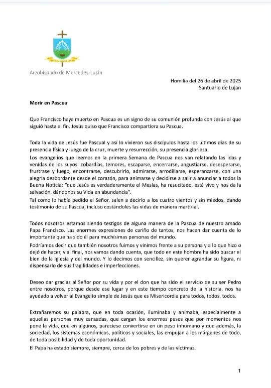 En horas del mediodía del sábado 26, horas después de la exequias del Papa Francisco en el Vaticano y en Roma, el Arzobispo de Mercedes Luján presidió una Misa por el Papa fallecido el lunes anterior en el Basílica de Luján.