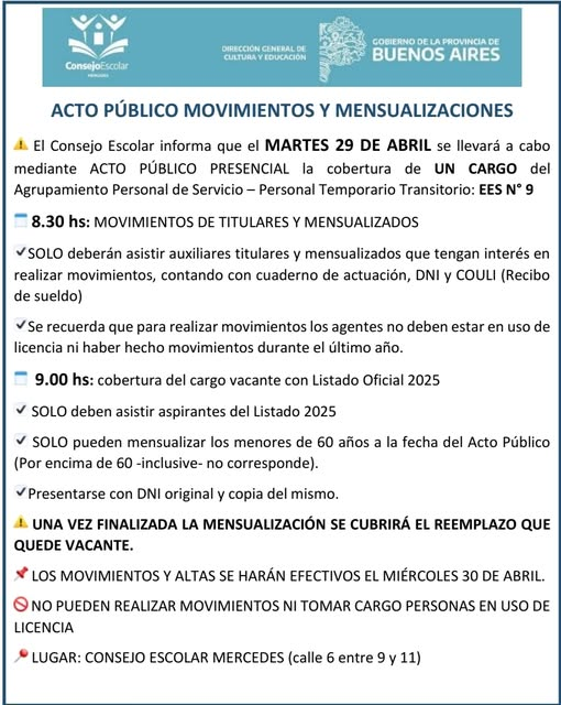 Desde el Consejo Escolar de Mercedes informaron que este martes 29 de abril, a partir de las 8:30 hs. se llevará a cabo el acto público presencial para personal de auxiliares en educación. En esta oportunidad, confirmaron que la vacante es en la EES N° 9 (Secundaria)