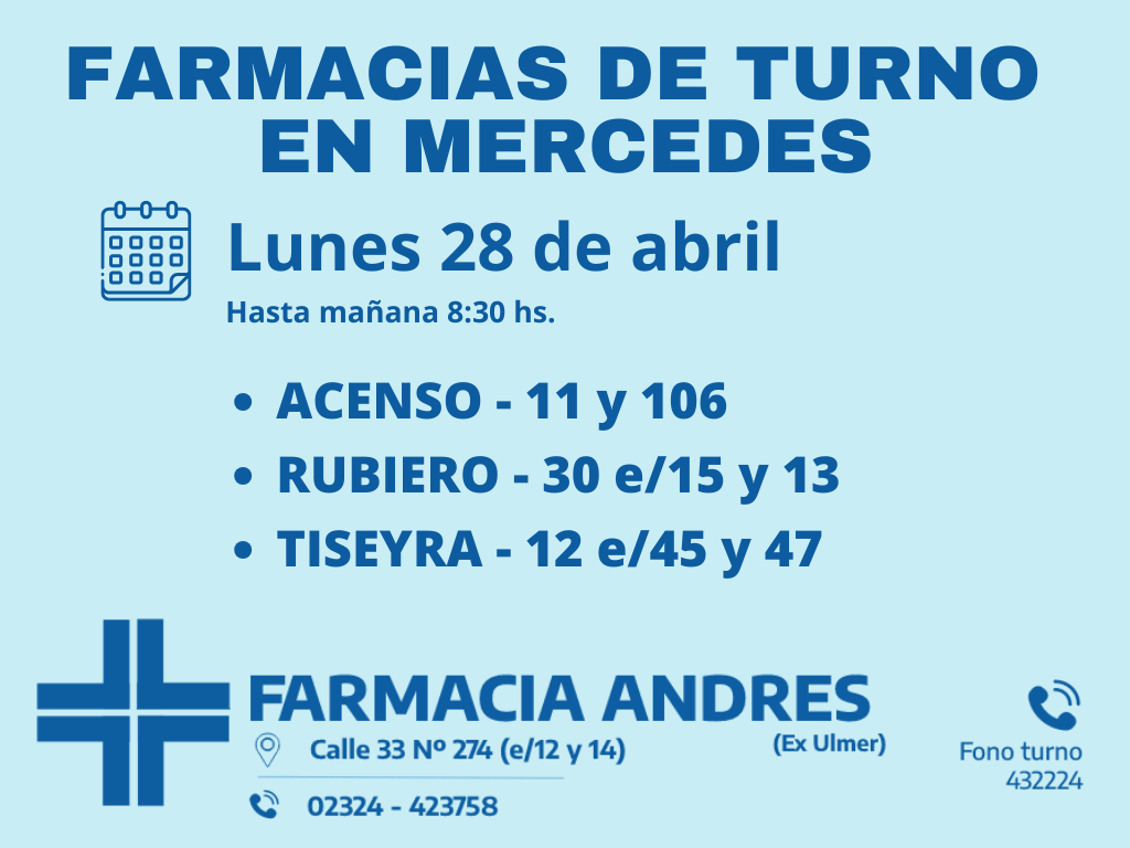Farmacias de turno del lunes 28 de abril 28 abril, 2025Desde las 8 30 del día de hoy hasta la misma hora de mañana las farmacias de turno en Mercedes son Acenso, Rubiero y TiseyraComparte esto: Haz clic para compartir en WhatsApp (Se abre en una ventana nueva) WhatsApp Haz clic para compartir en Telegram (Se abre en una ventana nueva) Telegram Haz clic para compartir en X (Se abre en una ventana nueva) X Haz clic para compartir en Facebook (Se abre en una ventana nueva) Facebook TE PUEDE INTERESARCOMENTARIOS Comentarios