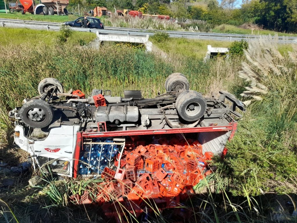 Un impresionante vuelco de un camión de reparto de la firma «Soda y Agua Panizza» conmocionó la Autovía 5 el pasado sábado, a la altura del kilómetro 68.500, frente al barrio Luna. El incidente, que milagrosamente no dejó víctimas fatales, resultó con un joven de 22 años herido y el vehículo incrustado en el arroyo Gutiérrez.