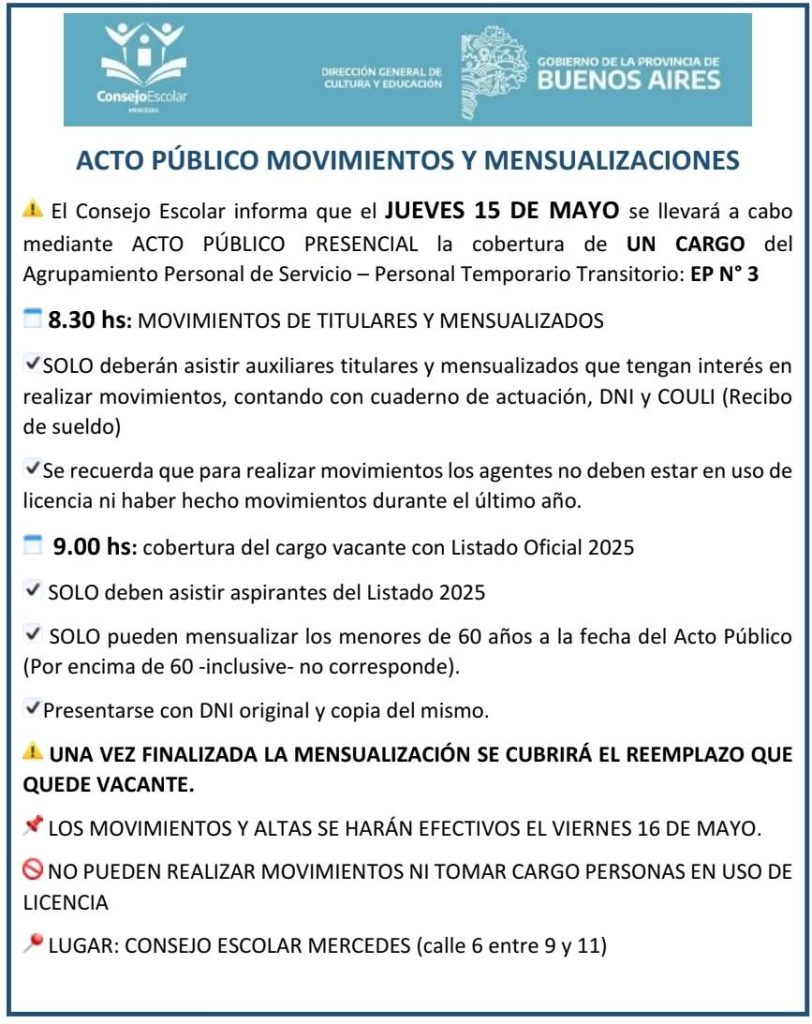 En la mañana del jueves 15, el Consejo Escolar realizará un acto público para auxiliares con el fin de cubrir un cargo en la Primaria N* 3.