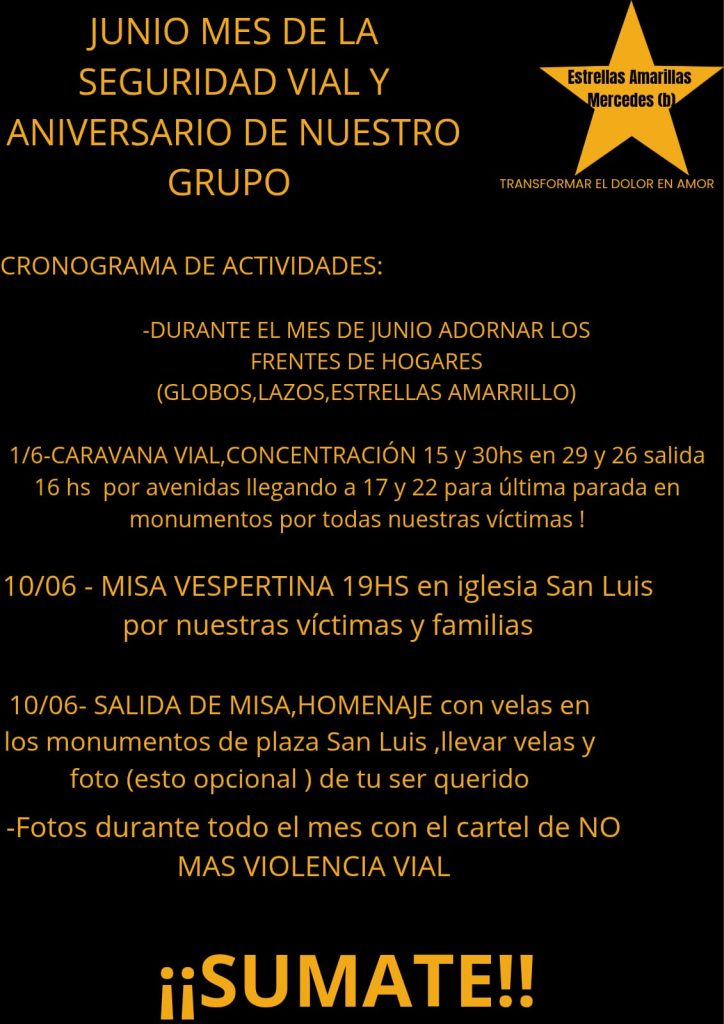 Desde Estrellas Amarillas Mercedes anunciaron que inician el Mes de la Seguridad Vial con una caravana vial a través de la ciudad. Será el domingo 1 de junio, desde las 15:30 hs. saliendo desde la intersección de 29 y 26. El rocorrido en vehículos será por las avenidas principales de la ciudad para terminar en la Plaza San Luis donde se encuentra la estatua que homenajea a las víctimas fatales de siniestros viales.
