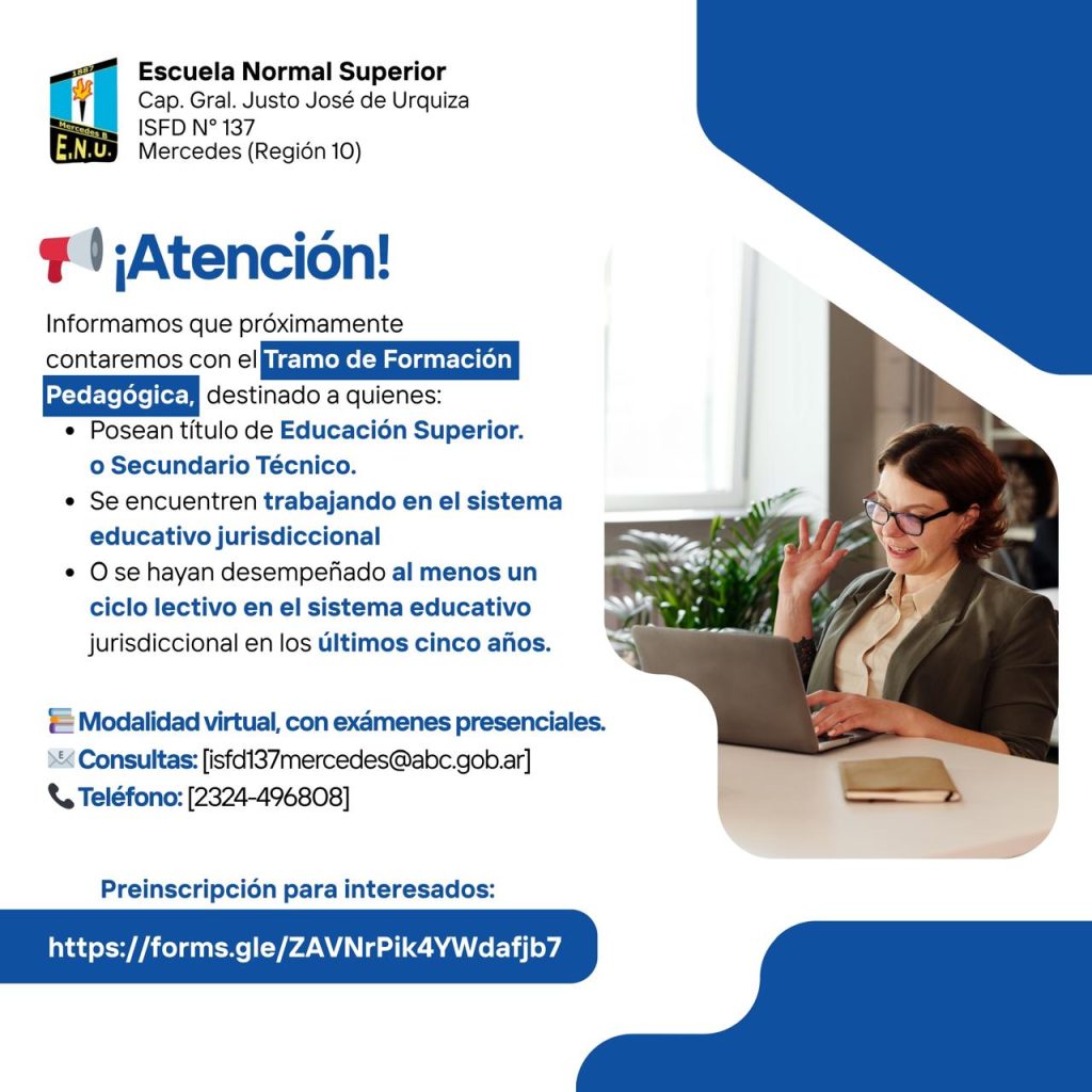El Instituto de Formación Docente N° 137 (Escuela Normal de Mercedes) anunció el lanzamiento de la preinscripción para el Tramo de Formación Pedagógica para profesionales, técnicos o quienes estén trabajando en instituciones educativas en los últimos cinco años y requieran la formación necesaria para titularizar.