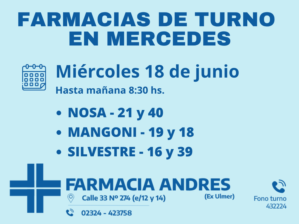 Farmacias de turno del miércoles 18 de junio 18 junio, 2025Desde las 8 30 del día de hoy hasta la misma hora de mañana las farmacias de turno en Mercedes son Nosa, Mangoni y SilvestreComparte esto: Haz clic para compartir en WhatsApp (Se abre en una ventana nueva) WhatsApp Haz clic para compartir en Telegram (Se abre en una ventana nueva) Telegram Haz clic para compartir en X (Se abre en una ventana nueva) X Haz clic para compartir en Facebook (Se abre en una ventana nueva) Facebook TE PUEDE INTERESARCOMENTARIOS Comentarios