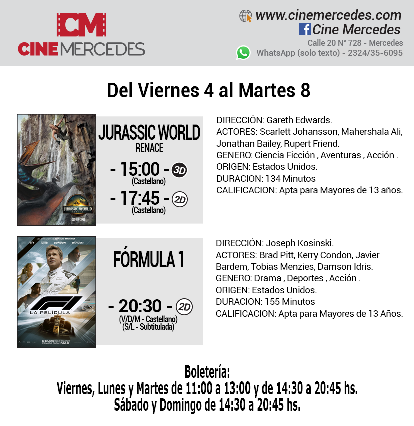 Desde el viernes 4 al martes 8 de julio, el Cine Mercedes estará presentando dos películas taquilleras. El estreno de la nueva Jurassic World (funciones 15 y 17:45 hs) y continúa la película dde Brad Pitt, Fórmula 1 (funciones 20:30 hs).