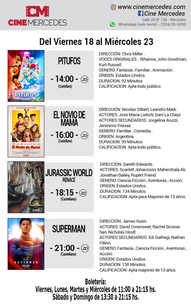 El Cine Mercedes extiende sus días y horarios de funciones en el marco de las vacaciones de invierno. Desde el viernes 18 al miércoles 23 de julio, cuatro películas se presentarán en la pantalla grande de la ciudad. «Pitufos», «El Novio de Mamá», «Jurassic Word» y «Superman» podrá verse en en la primera semana del receso invernal.