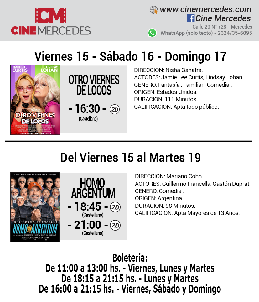 Desde el viernes 15 al martes 19 de agosto, el Cine Mercedes propone para la cartelera local cinematográfica el estreno más esperado del cine argentino «Homo Argentum» con Guillermo Francella interpretando 16 personajes. Mientras que en las funciones del finde largo continúa «Otro Viernes de Locos».