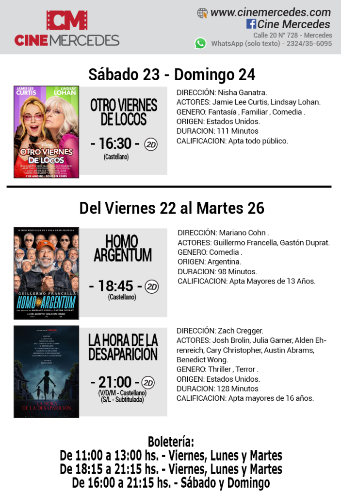 El Cine Mercedes anuncia tres películas en su cartelera. En las funciones de 16:30 horas del sábado y domingo sigue «Otro Viernes de Locos». Mientras que hasta el martes 26 de agosto el exito de «Homo Argentum» sigue en las funciones de 18:45 hs y se estrena «La Hora de la Desaparición» en las funciones de las 21.