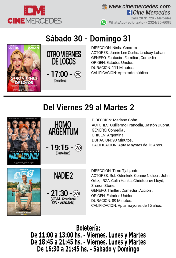 El Cine Mercedes presenta en su gran pantalla tres películas para la semana del viernes 29 de agosto al martes 2 de septiembre. En cartelera siguen los éxitos «Homo Argentum» y «Otro Viernes de Locos». Aunque se suma una comedia norteaméricana con acción titulada «Nadie 2».