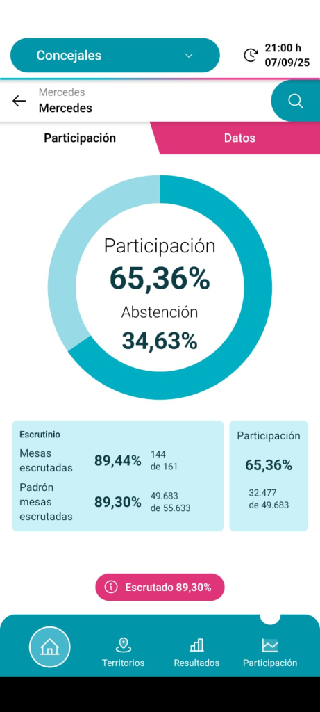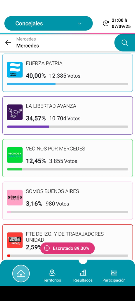 La provincia de Buenos Aires dio a conocer los primeros datos de los resultados en las localidades bonaerenses. En Merces, de acuerdo a los primeros datos publicados a las 21 horas, dan un 40% con 12.385 votos para Fuerza Patria, mientras que La Libertad Avanza sumó 10704 voto con el 34,57% de los votos. Con estos resultados, las dos fuerzas tendrían representación parlamentaria. La tercera fuerza, que podría meter un concejal, sería la fuerza vecinalista, Vecinos Por Mercedes, que hasta el momento tiene 12,45% de los votos con 3.855 votos.