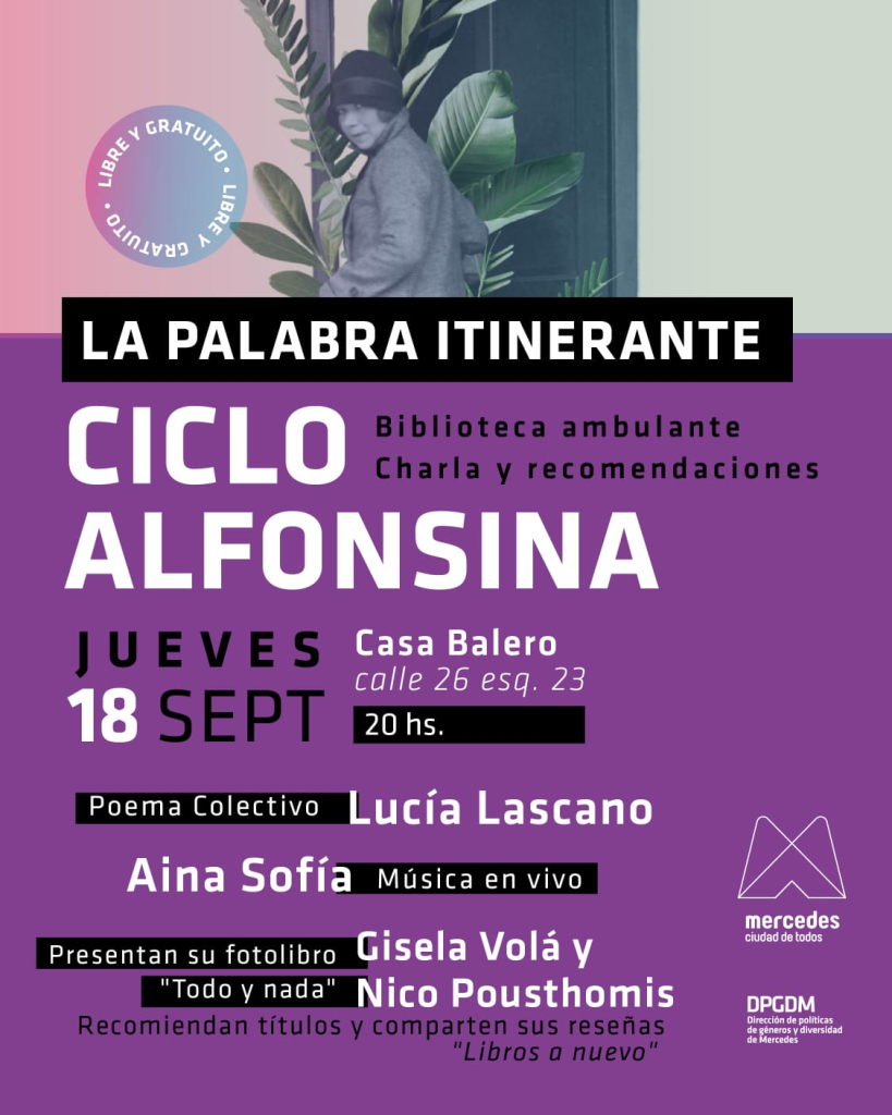 El jueves 18 de septiembre vuelve el Ciclo Alfonsina, un espacio en donde la biblioteca de la Dirección de Políticas de Género y Diversidad de Mercedes.