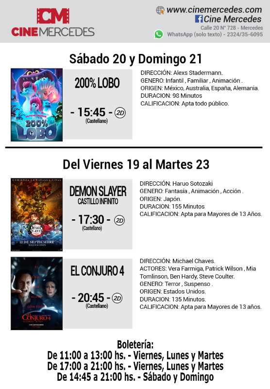 Desde el viernes 19 al martes 23 de septiembre, el Cine Mercedes presenta en la gran pantalla tres opciones. Continúan en cartelera «Demon Slayer» y «El Conjuro 4». Suman «200% Lobo».