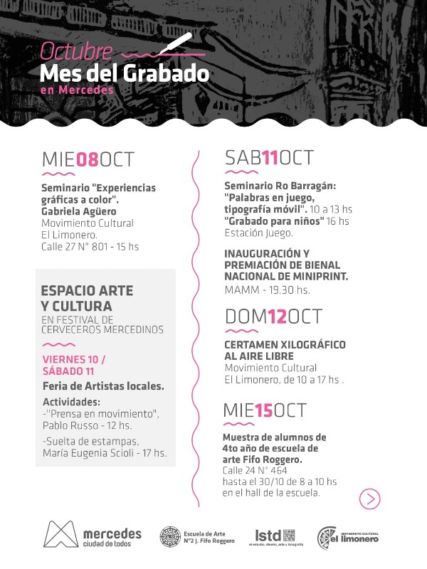 El último sábado dio comienzo a una nueva edición del Mes del Grabado. Una movida cultural que a lo largo de octubre se hará presente en distintos espacios de arte de la ciudad. El inicio se dio en el Museo de Arte (MAMM), y se hará entre otros lugar, en El Limonero, la Escuela de Arte «Fifo Roggero», El Estudio Fotografía, entre otros espacios públicos y privados.