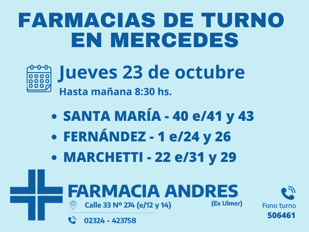 Desde las 8 30 del día de hoy hasta la misma hora de mañana las farmacias de turno en Mercedes son Santa María, Fernández y Marchetti