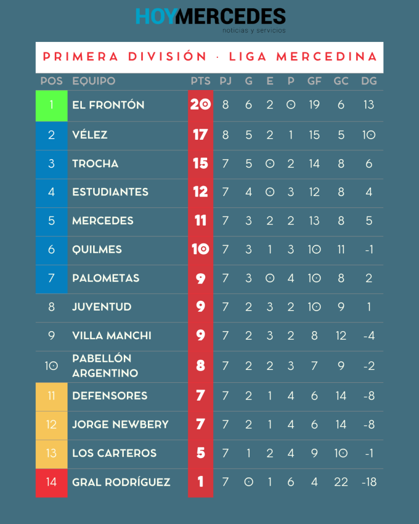 Tras la suspensión de todo lo que estaba pautado el fin de semana por la lluvia y luego las elecciones, el único partido que se jugó por la octaba fecha del torneo de la Liga Mercedina fue el de El Frontón y Vélez, en San Andrés de Giles, que estaba pautado para este miércoles ya que los de la vecina localidad están jugando el Regional Amateur. En ambas categorías ganó el local.