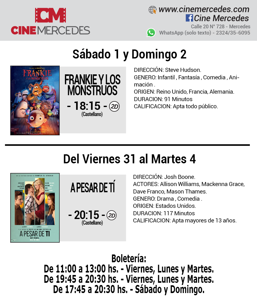 Desde el viernes 31 de octubre y hasta el martes 4 de noviembre, el Cine Mercedes propone dos películas en la gran pantalla local. «A Pesar de Tí» es la película que podrá verse todos los días en horario central, mientras que el film de animación «Frankie y Los Monstruos» se verá el sábado 1 y domingo 2 a las 18:15 hs.