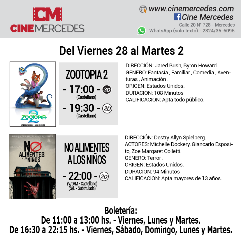 Desde el viernes 28 de noviembre, al martes 2 de diciembre, el Cine Mercedes presenta dos opciones en la pantalla local. Para los más pequeños, llega el estreno de la semana, la segunda parte de Zootopía con dos funciones diarias. Mientras que para los fanáticos del terror, la propuesta es «No Alimentes a los Niños».